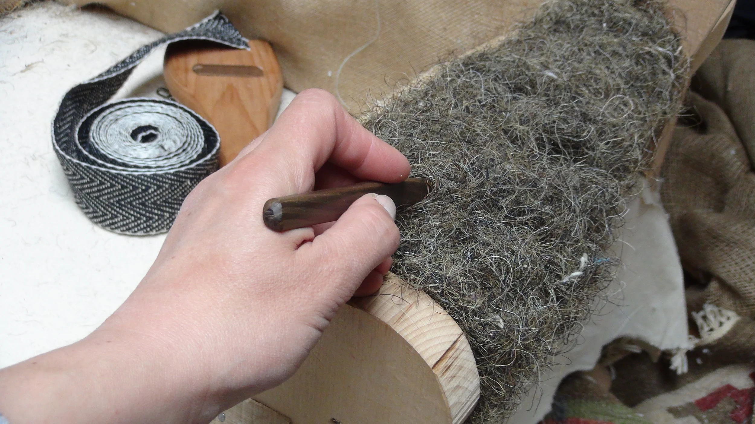 Traditional and natural materials - curled mixed hair, jute hessian, woollen felt, cotton linterfelt, fibre/hair pads, feather/down - are standard in all commissions.
